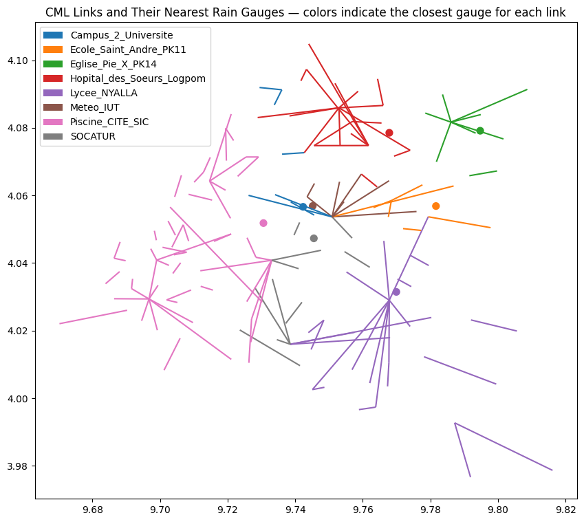 To assign a gauge to each link, we approximate the link’s position by its center point (midpoint of the two antenna sites), then find the closest gauge to that center.
